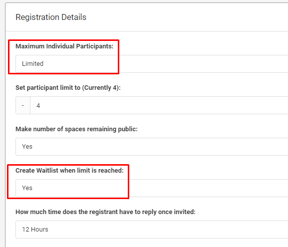 To have the system automatically create a waitlist when the registration is full, set Maximum Individual Participants to "Limited," set your limit, and check Create Waitlist when limit is reached to "Yes."
