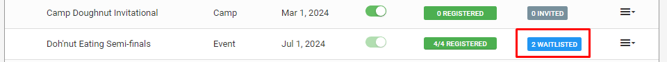 You can choose to invite a registrant to the event if for example, a spot becomes empty. Click the blue Waitlist button highlighted above to view the waitlist.