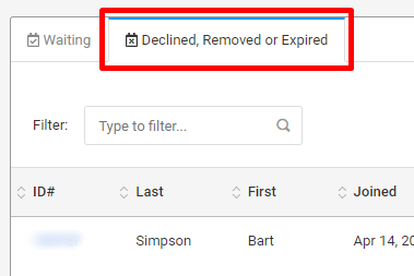 If there are people who have been removed from the waitlist, or who were invited but either declined to register or their invitation expired, you can view them by clicking the "Declined, Removed or Expired" tab.