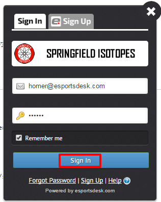 Click Sign In under the Registrations box, or at the top of the Registrations page (as shown below). If you don't have an account yet, Create an esportsdesk.com User Account here.