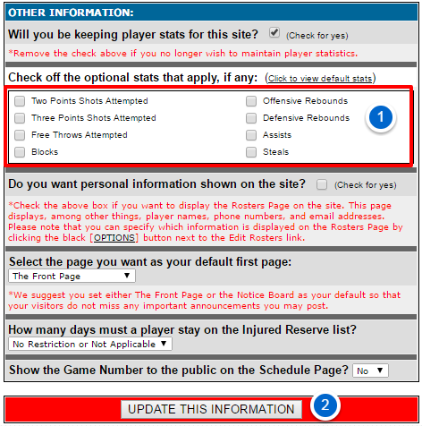Now that you have enabled player stats for the site you also have the option to select additional statistics you may want to track. If you make any changes, be sure to click Update this Information (in the red bar at the bottom of the page).