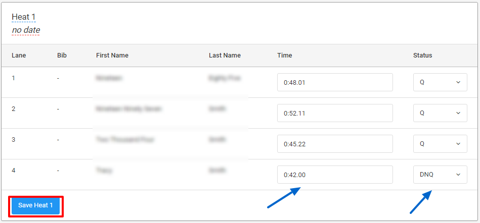 For each Heat, enter each Athlete's finishing time/result, and select Status (e.x.: Q, DNF, etc.) Click Save Heat (#) to save the Results.