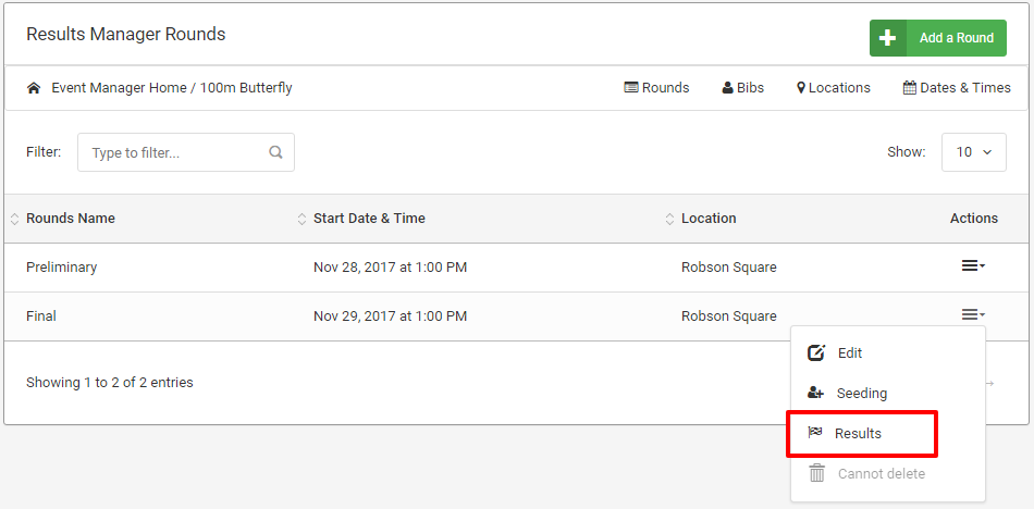 With the Rounds already populated, it is time to start Seeding. Next to the name of the round (Ex: Preliminary), click on the Actions menu, then click Seeding.
