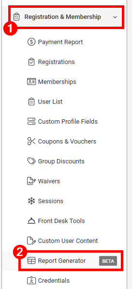 Click on Report Generator (Beta) under the Registration & Membership section of the admin navigation menu