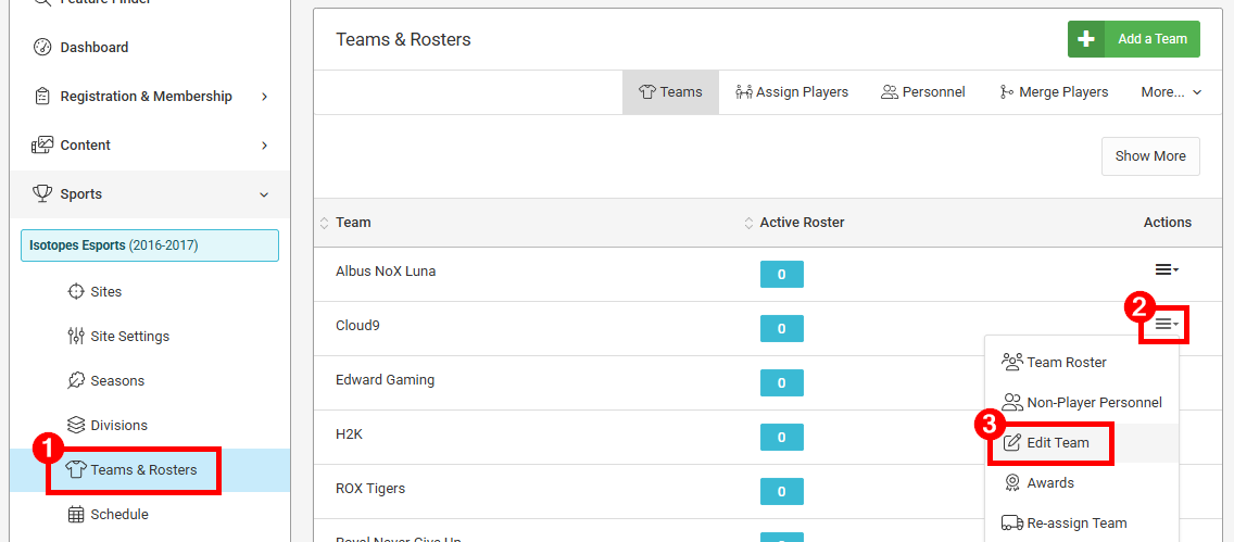 Select Teams & Rosters from the navigation menu and then Edit Team from the Actions menu for the team you want to show or hide:
