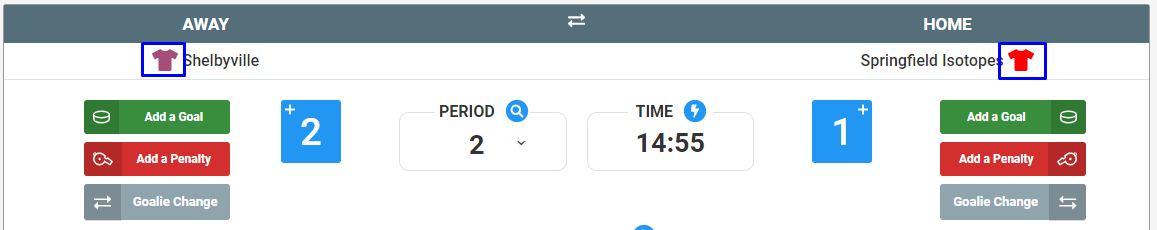 To choose a jersey color for a team, click on the jersey icon as indicated below for the corresponding team.