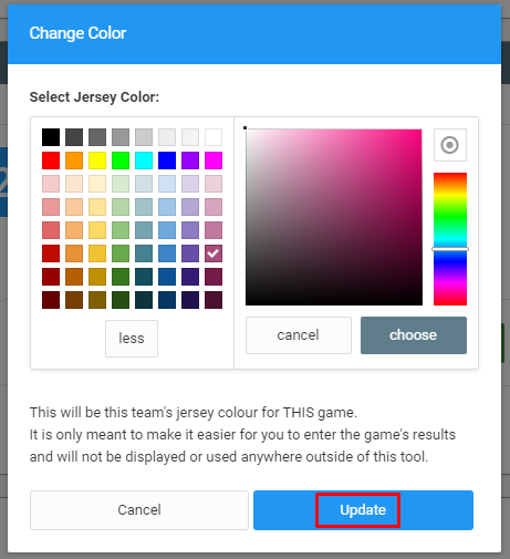 Choose your jersey color and click to Update when finished. If you wish to remove the team's jersey color (for this game only), you can click the circle icon in the top-right of the color selector and then click Update.